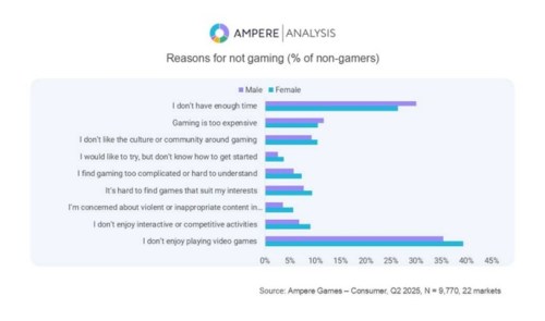 Ampere found that women are less likely to cite cost and time as deterrents to playing games than men. However, gaming culture and community, as well as finding relevant, appropriate content and entry-level experiences, were identified as greater barriers for female non-gamers than male ones.