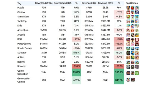 The puzzle genre led the way in both revenue and downloads, with the former up 7.6% YoY to $8.25bn, and the latter increasing 9.9% YoY to 7.7bn.