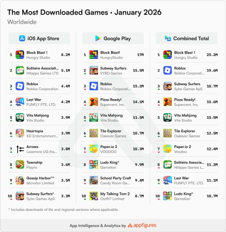 Block Blast held off Roblox for a fourth consecutive month to remain the world’s most-downloaded mobile game in January.