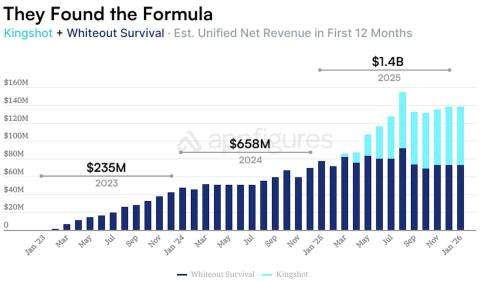 Notably, Whiteout Survival’s earnings haven’t really slowed down since Kingshot launched last February. The older game is still bringing in over $70m per month, and the titles earned approximately $140m in combined net revenue in January 2026.