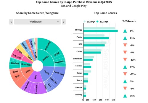 Strategy and puzzle games accounted for 45% of all gaming IAP revenue in Q4. Strategy revenue grew 9% YoY to reach $5.31bn, while puzzle revenue increased 21% YoY to $3.94bn.