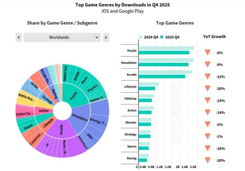 Puzzle games led the way with 2.42bn downloads (-8% YoY), followed by simulation titles with 2.38bn downloads (-9% YoY), and arcade games with 2.22bn downloads (-12% YoY).