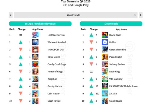 Block Blast overtook Roblox to lead downloads in Q4, while Garena Free Fire, Pizza Ready and Subway Surfers rounded off the top five. Clash Royale was the only title to place in the top 10 in both revenue and downloads.