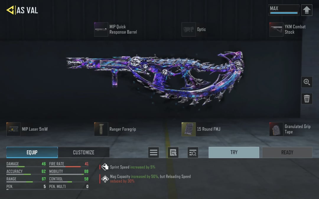At the same time there have been situations where I needed to switch to a RAM7 to finish the kill due to lack of ammo. The extended mag affix AS VAL could have done the job better there.