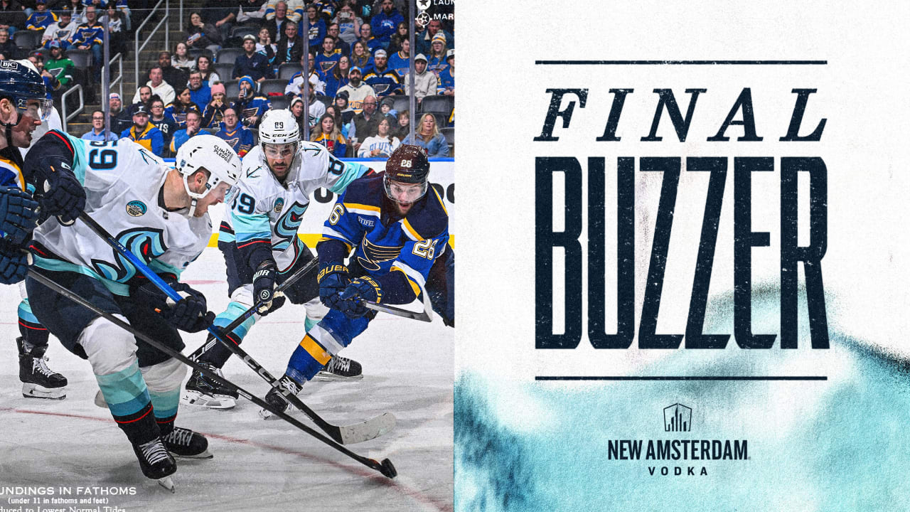 The visitors did recover somewhat before the end of the period, unleashing a five-shot barrage in just a couple of minutes at backup Blues netminder Joel Hoefer. Kakko popped home a rebound off one of those shots to tie the game up. But further Kraken chances in close were rare indeed.