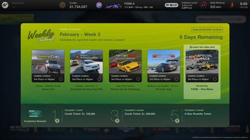 In order to have access to the Weekly Challenges you’ll need to have completed GT Cafe Menu Book 39 and watched the ending movie. The events update at midnight local time on Friday mornings, so we’d expect the next set of the new-look events on the morning of Friday March 6.