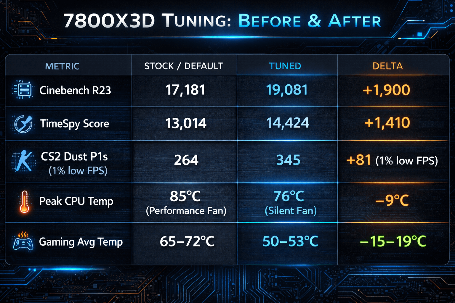 • Gaming Avg CPU Temp: 65–72°C → 50–53°C (-15–19°C)