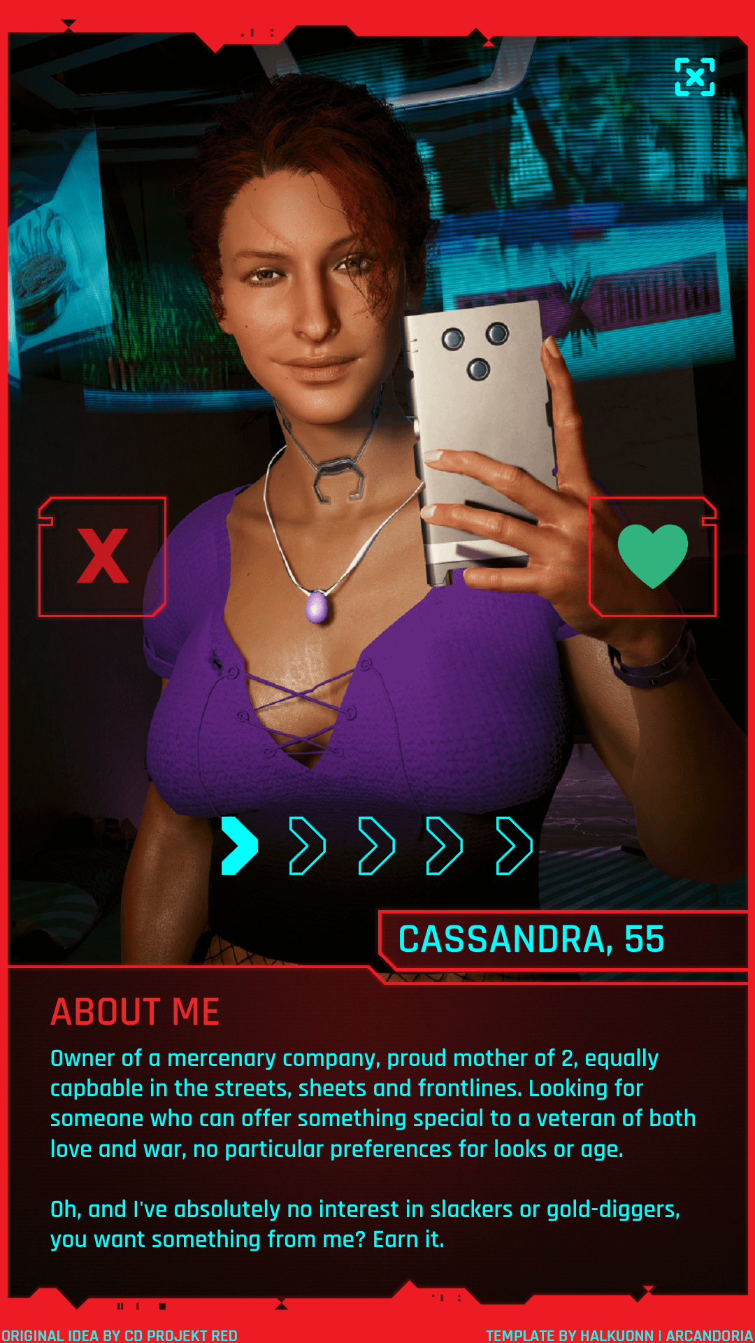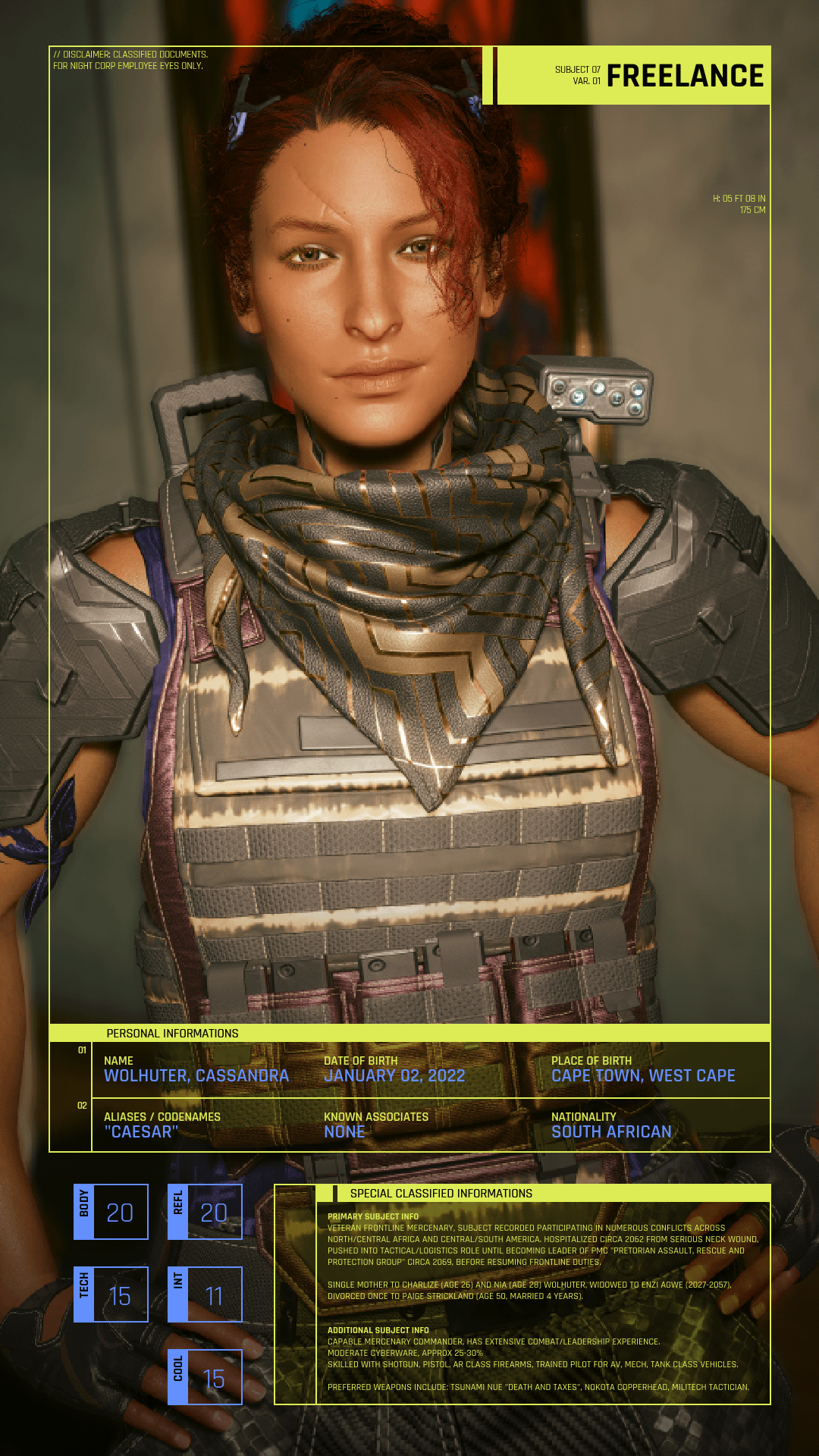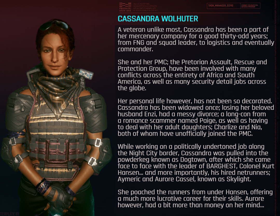 A merc unlike most, Cassandra is an emodiment of the phrase "Beware an old (wo)man in a profession where (wo)men usually die young." Veteran of both life and work, she is a proud mother of two, one time widow and one time divorcee, who has worked up the ranks of her PMC; the Pretorian Assault, Rescue and Protection Group to become its CEO and field commander.