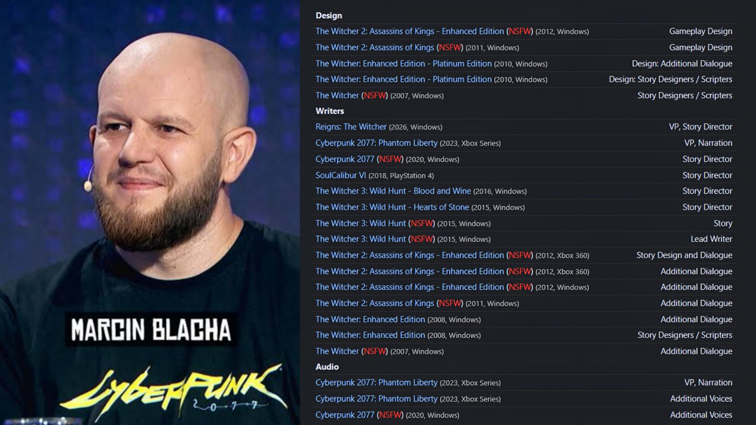 Marcin Blacha, Lead Writer and Story Director of Witcher 3 (+DLCs) and Cyberpunk (+PL), is celebrating his 20th anniversary at CDPR. Currently involved in Witcher 4 and CDPR’s next original IP (Hadar)