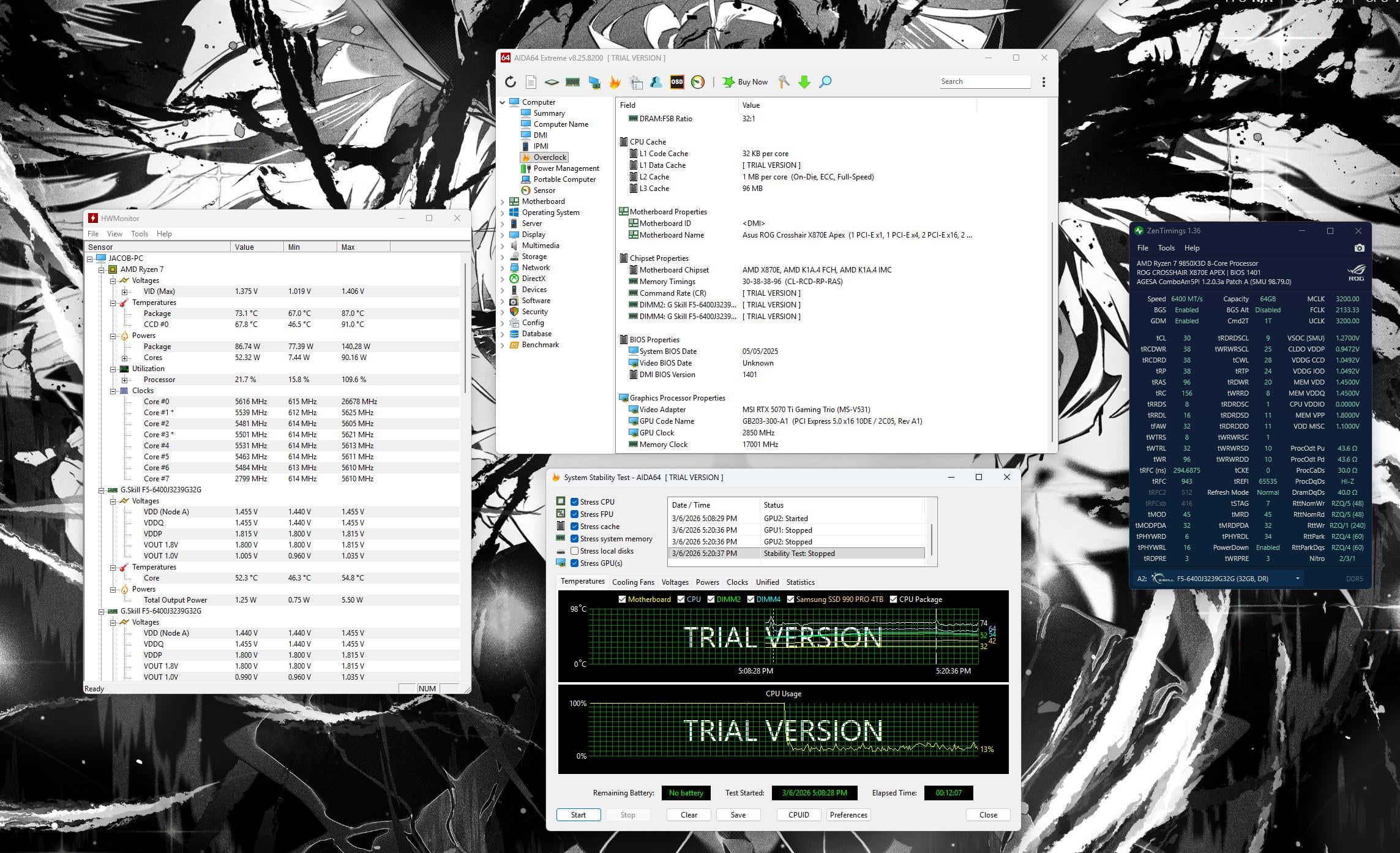 first time overclocking my ram and cpu and was wondering if I should stay on 6400 1:1 with a vsoc of 1.27 (unstable at 1.25) or change it to 6200 with tighter timings and a lower vsoc. Also my cpu oc can only go to 200+ boost and -15 all cores (crashes at -20). I was able to go to -30 when I ran my ram at 6000 mhz cl28. Also I will run Aida64 longer just was testing the waters for now. Any tips to lower vsoc or increase boost to 5.7