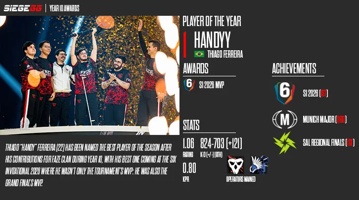 SiegeGG have chosen Thiago “Handy” Ferreira as the best player in Rainbow Six Siege’s Year 10. His contributions at the Six Invitational 2026 heavily impacted his final position on the ranking, elevating him up to first place.