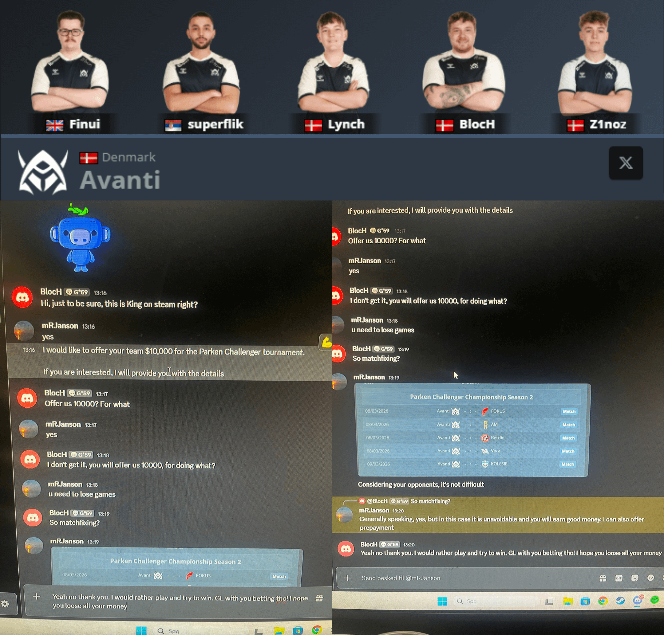 Avanti player BlocH has exposed messages from an individual asking him to match-fix in an upcoming Parken Challenger tournament