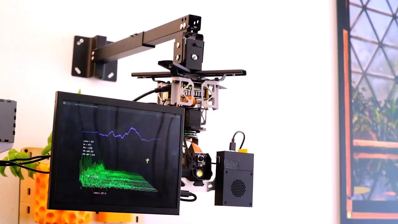 The build is based on a Waveshare 360° pan-tilt camera module and a Raspberry Pi. The whole thing is mounted to a small projector mount and paired with a 9.7" portable monitor and an IKEA FREKVENS speaker. I ended up flipping the pan-tilt module upside down and designing a custom mounting plate to make everything stable.