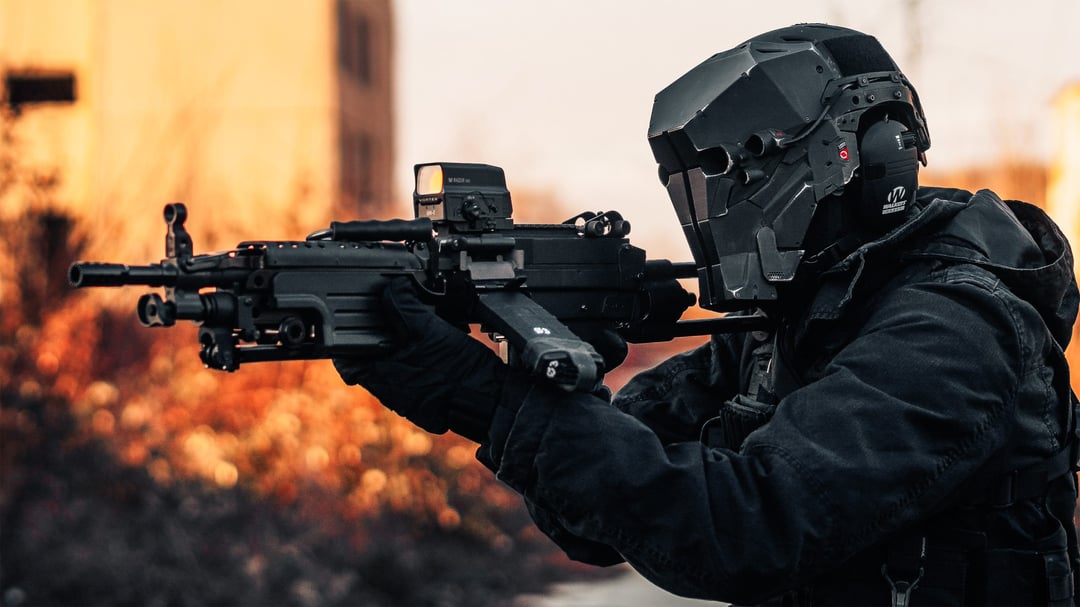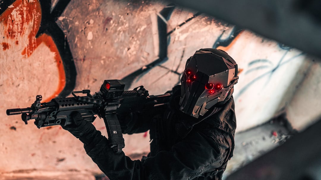 I built this cyberpunk helmet and called it Apex Predator. The whole piece was modeled, 3d printed and assembled in my workshop. After assembly it was hand painted and weathered to give it a more worn industrial look.