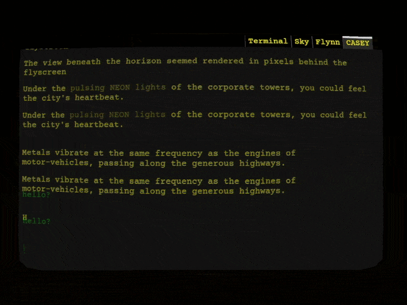 I initially started the project with the mindset that the player should feel like Neo in the beginning of the first movie (this scene). I tried to make the terminal screen and the keyboard sounds similar to computer "Mother" from Alien movies. For the cyberpunk setting, I was mostly inspired by Serial Experiments: Lain and Neuromancer alongside my favorite movie Blade Runner.