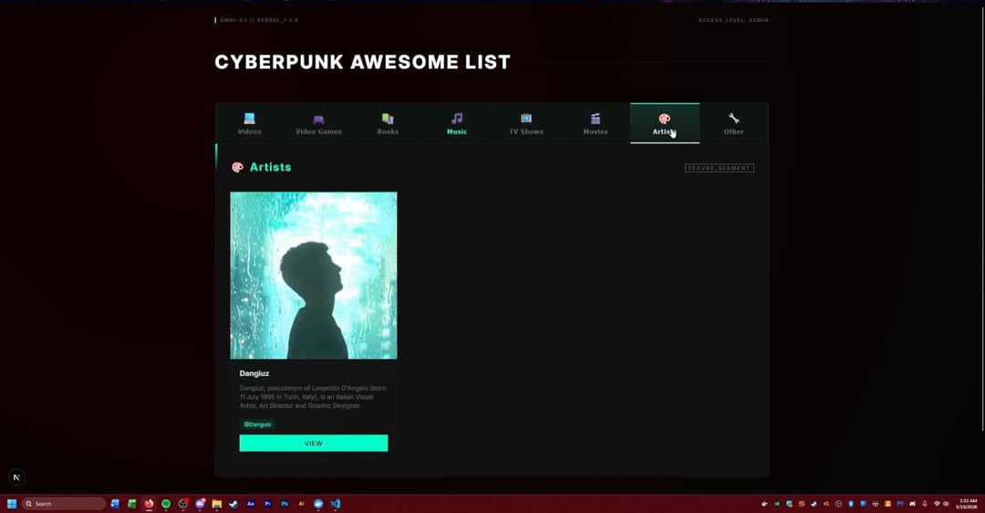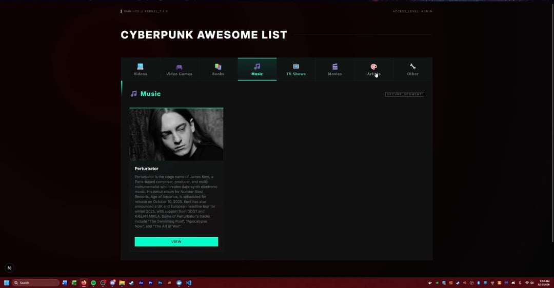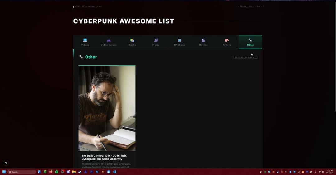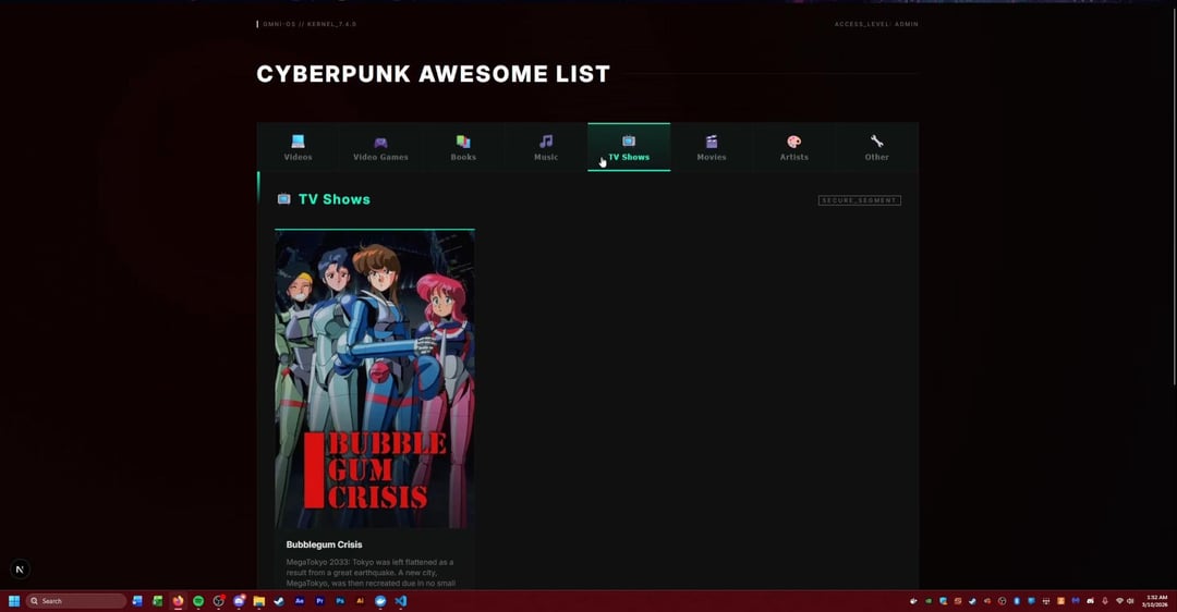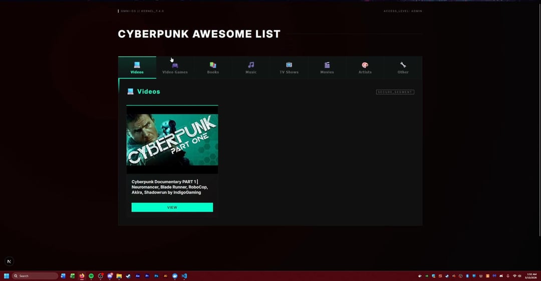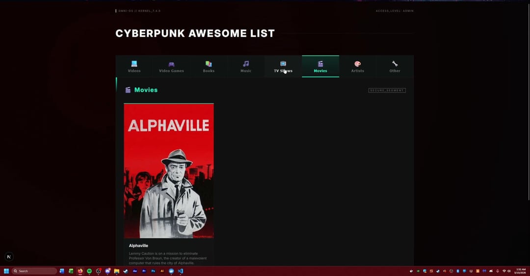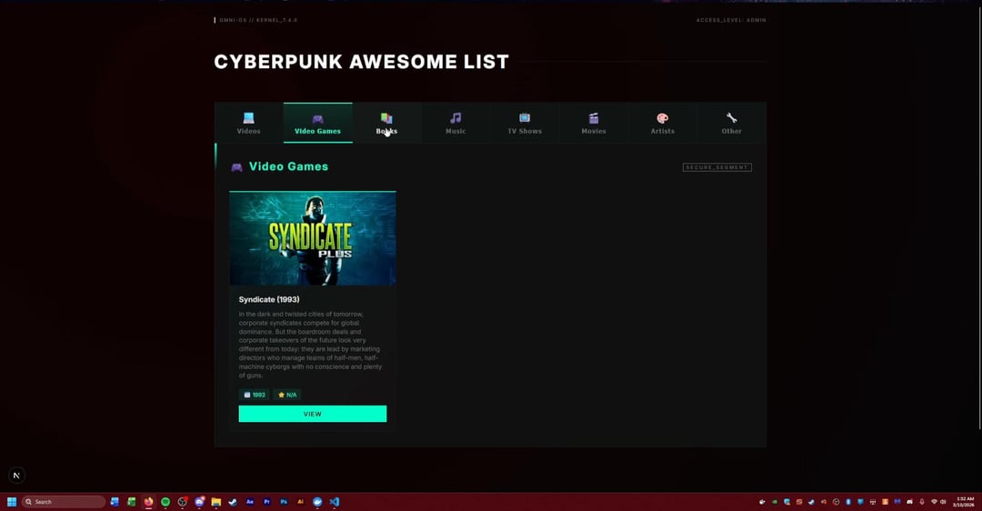 A while back I made a GIST for all things cyberpunk and after a friend pushed me to develop more I have now gone off the deep end turning the GIST into a full website that I may put up one day. This project was mostly for me to learn React, Next.js, postgrSQL databases, and Docker. Any suggestions or ideas are welcome