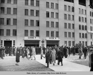 1939 photo of crowds outside football stadium entrance at Louisiana State University in Baton Rouge, La. (via Louisiana Digital Library).