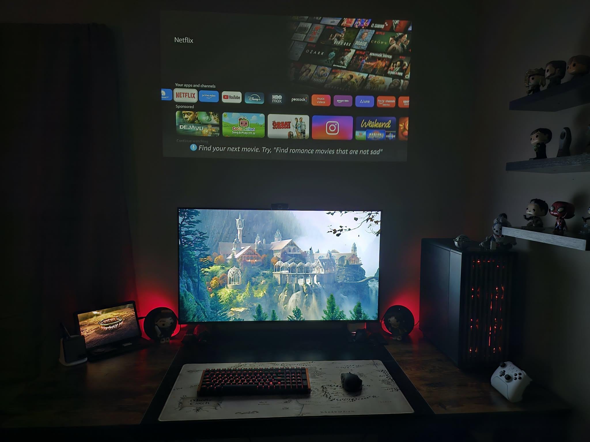 Share Facebook Twitter Pinterest LinkedIn Added the ceiling mounted projector last night. Planning to get a drop down screen so the wall space can still be used for decoration, but I'm thrilled with the result in the meantime. Just wanted to share with the internet. 🥲 Battle StationsBattlestations