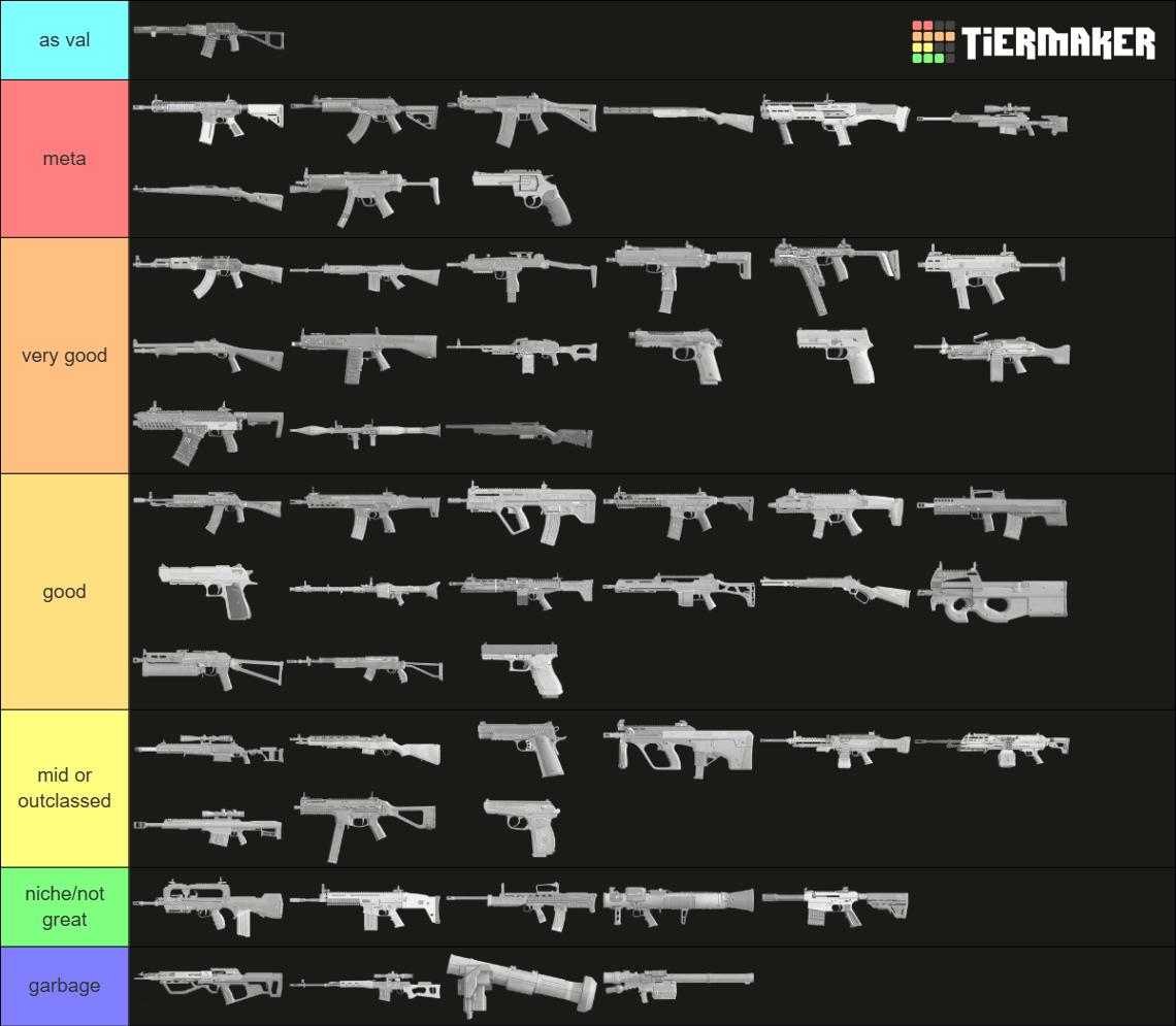 mid/outclassed: middle of the pack, other weapons do their main "thing" better