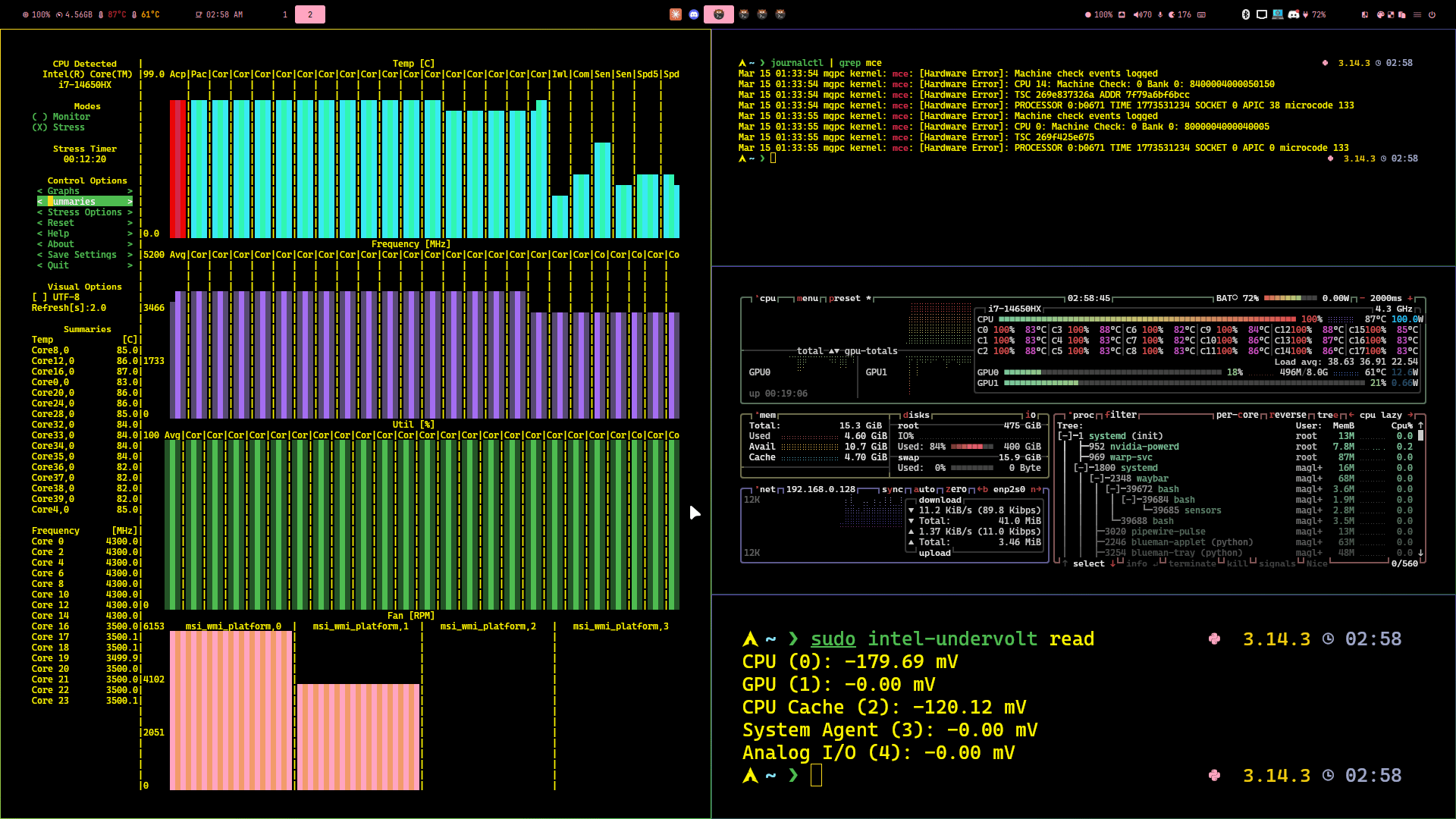 Hey, just got into undervolting on my MSI Katana with an i7-14650HX. Running Arch with intel-undervolt. Took a few hours tonight to find stable values.