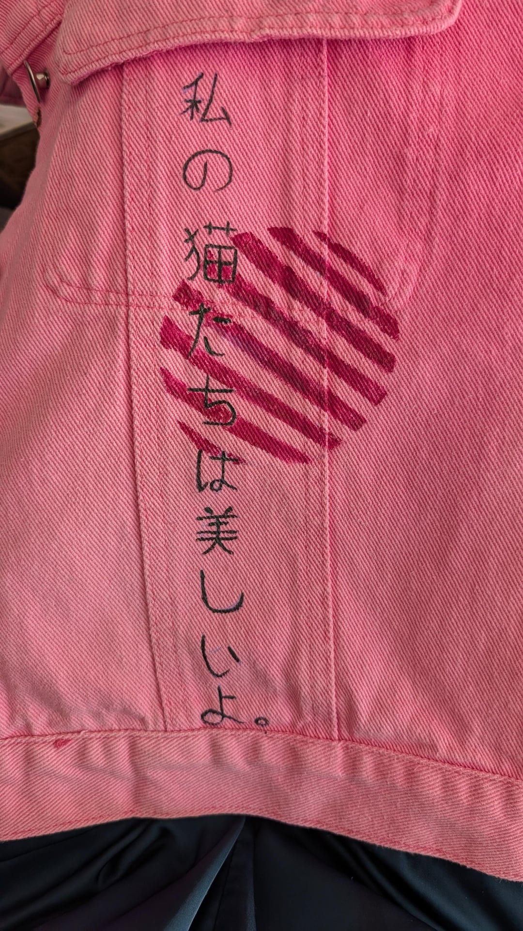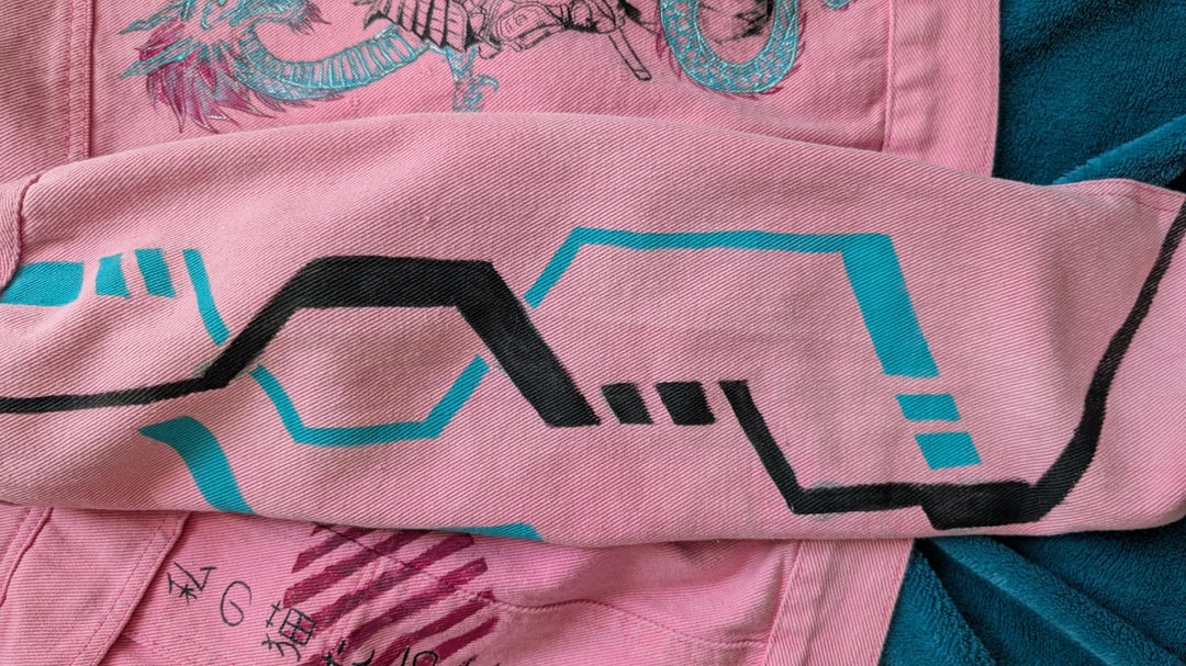 But knowing how much she loves the Cyberpunk-punk vibe, I couldn't just leave it at that. I started experimenting with the contrast between the soft pink denim and aggressive, neon-inspired geometry on the sleeves.