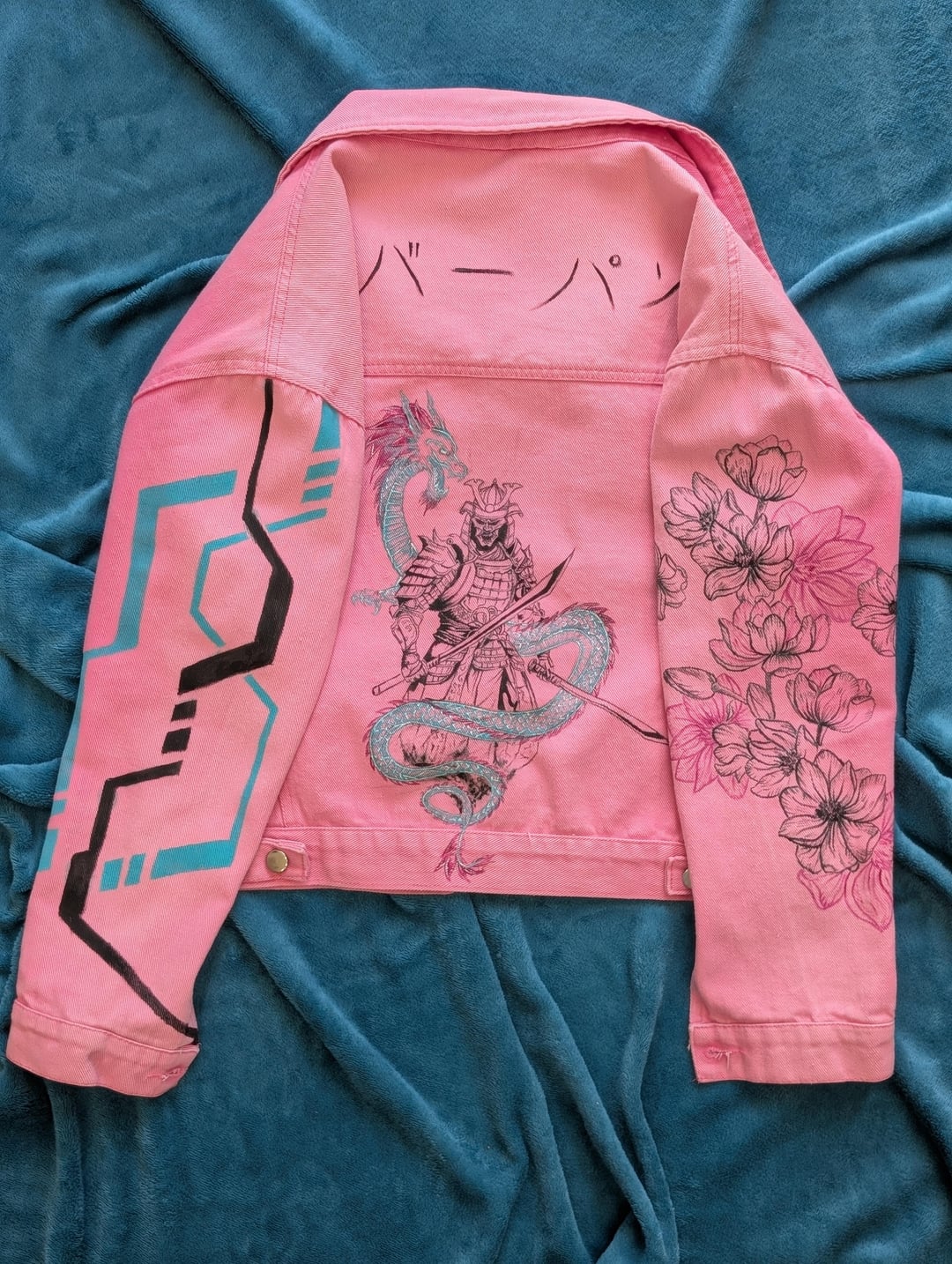 This is a fully custom piece, hand-painted with professional fabric paints. It took a lot of layering to get the teal and black to look that sharp on pink fabric. What do you think of this style mashup?